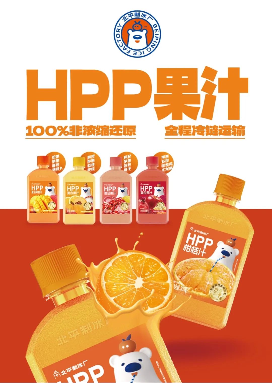 「HPP果汁系列」始终贯彻“新鲜·健康·无添加”这一产品理念。其中HPP柑桔汁采用具有国家地理标志的丹江口武当蜜桔,每一颗桔子都是精心挑选,从采摘到工厂榨汁,再到消费者手中,每一口都是新鲜味道,同时采用先进的HPP低温超高压鲜榨灭菌技术,尽可能的保留果汁的营养价值,北平制冰厂只为鲜质生活!